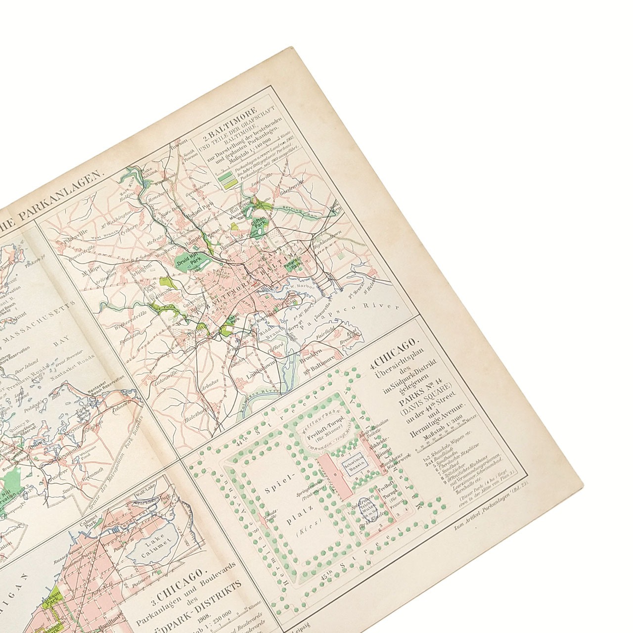 マイヤー百科事典から20世紀初頭当時のアメリカの公園4か所の見開き1ページのカラー地図。