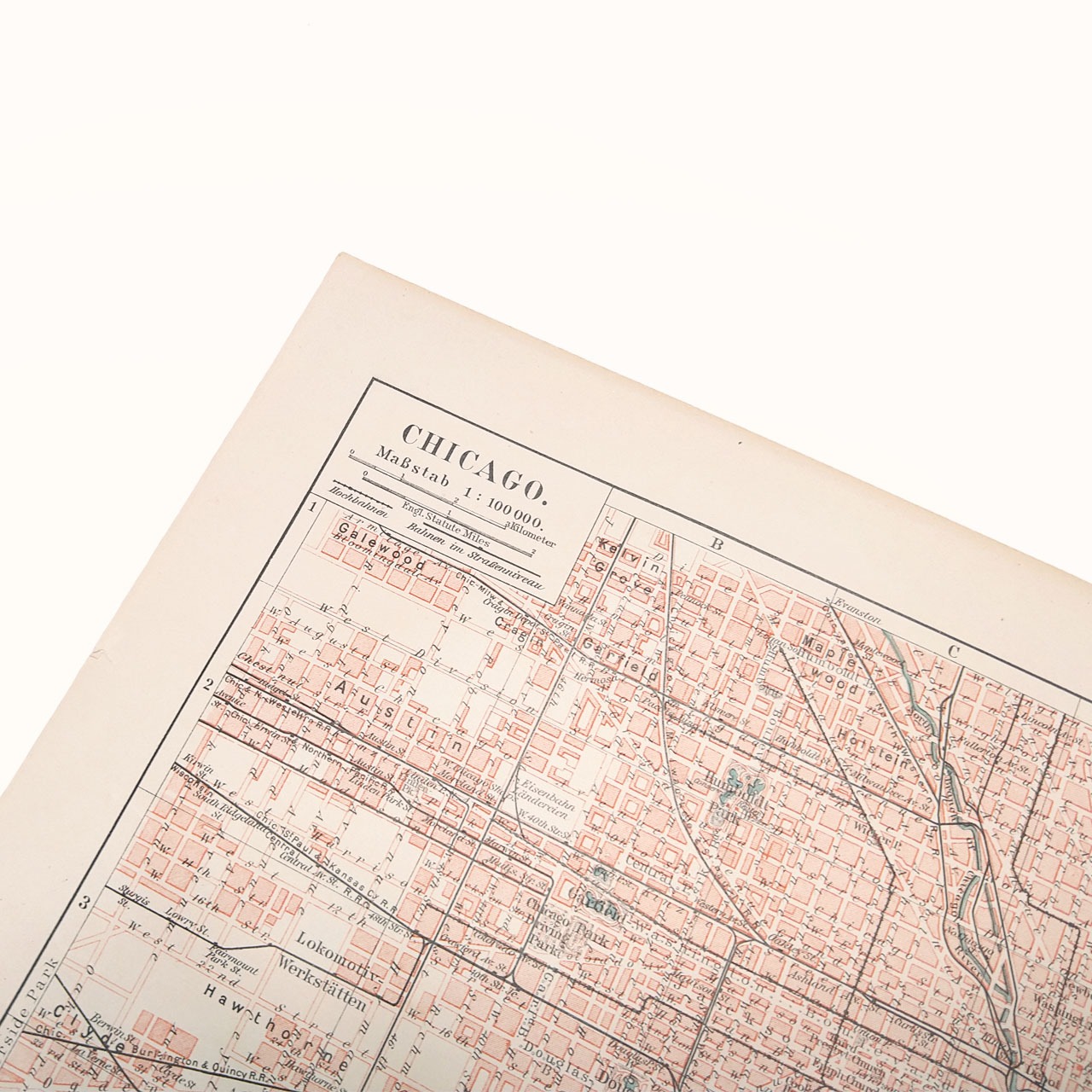 マイヤー百科事典から20世紀初頭当時のアメリカ・シカゴの見開き1ページのカラー地図。