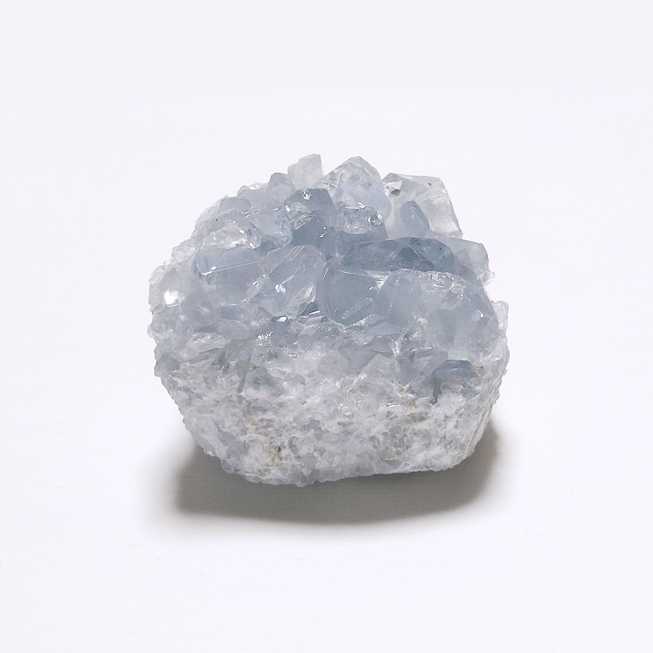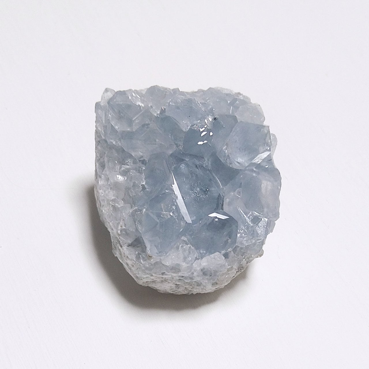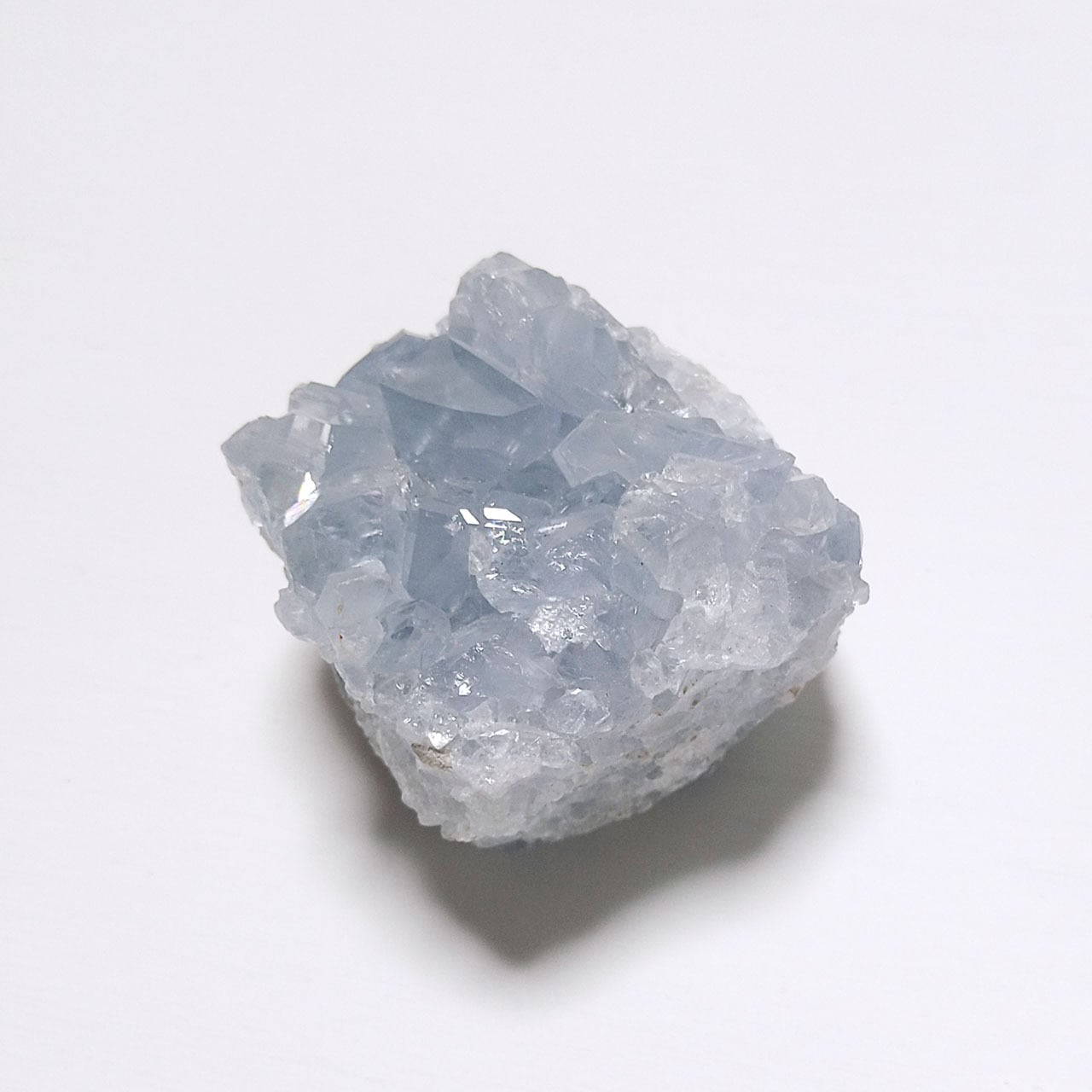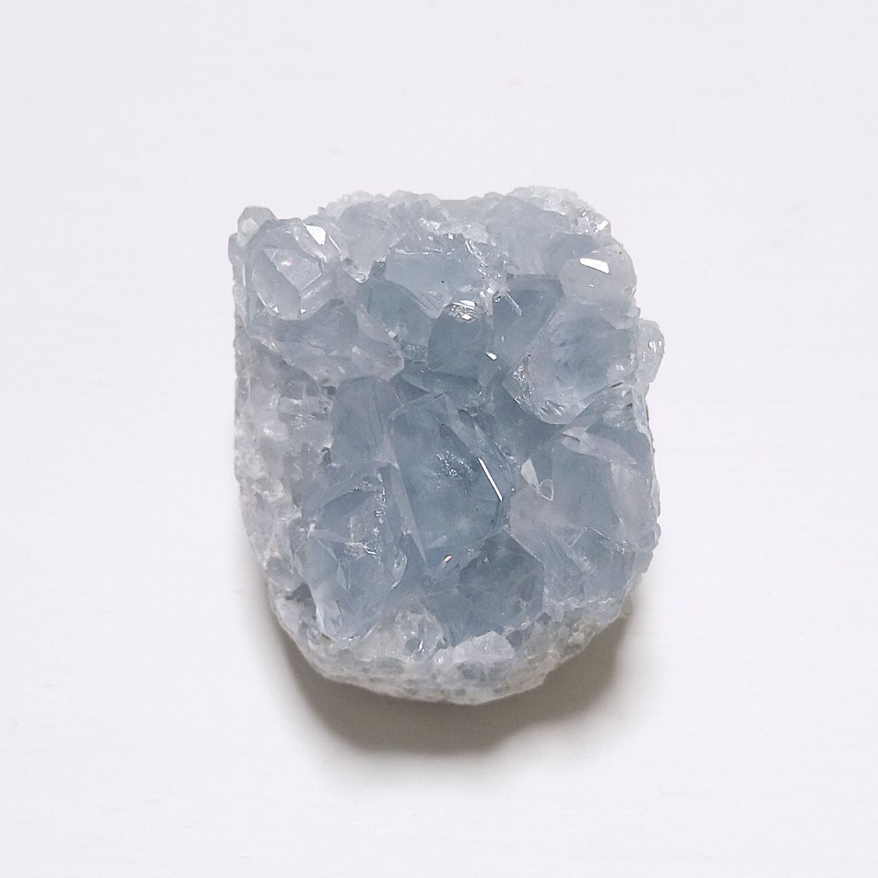 ころっと丸みを帯びた四角型のセレスタイトのクラスター原石。