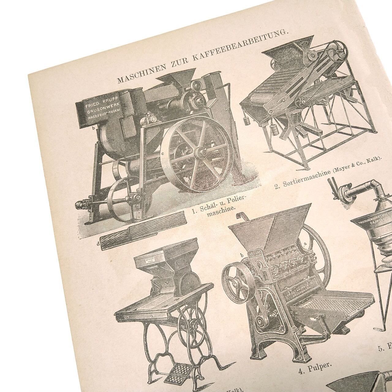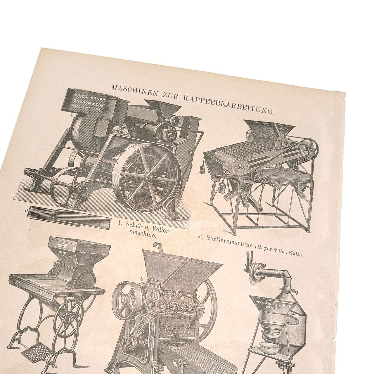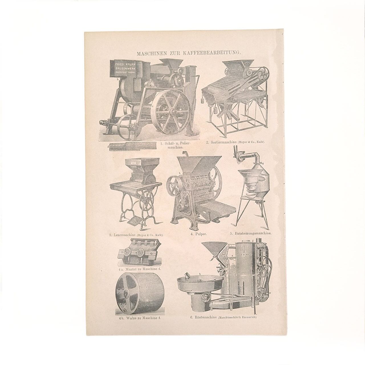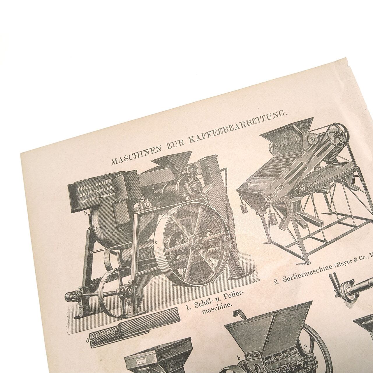 ヘルダー大百科事典からの当時のコーヒーとコーヒー加工機の両面イラストの図版です。