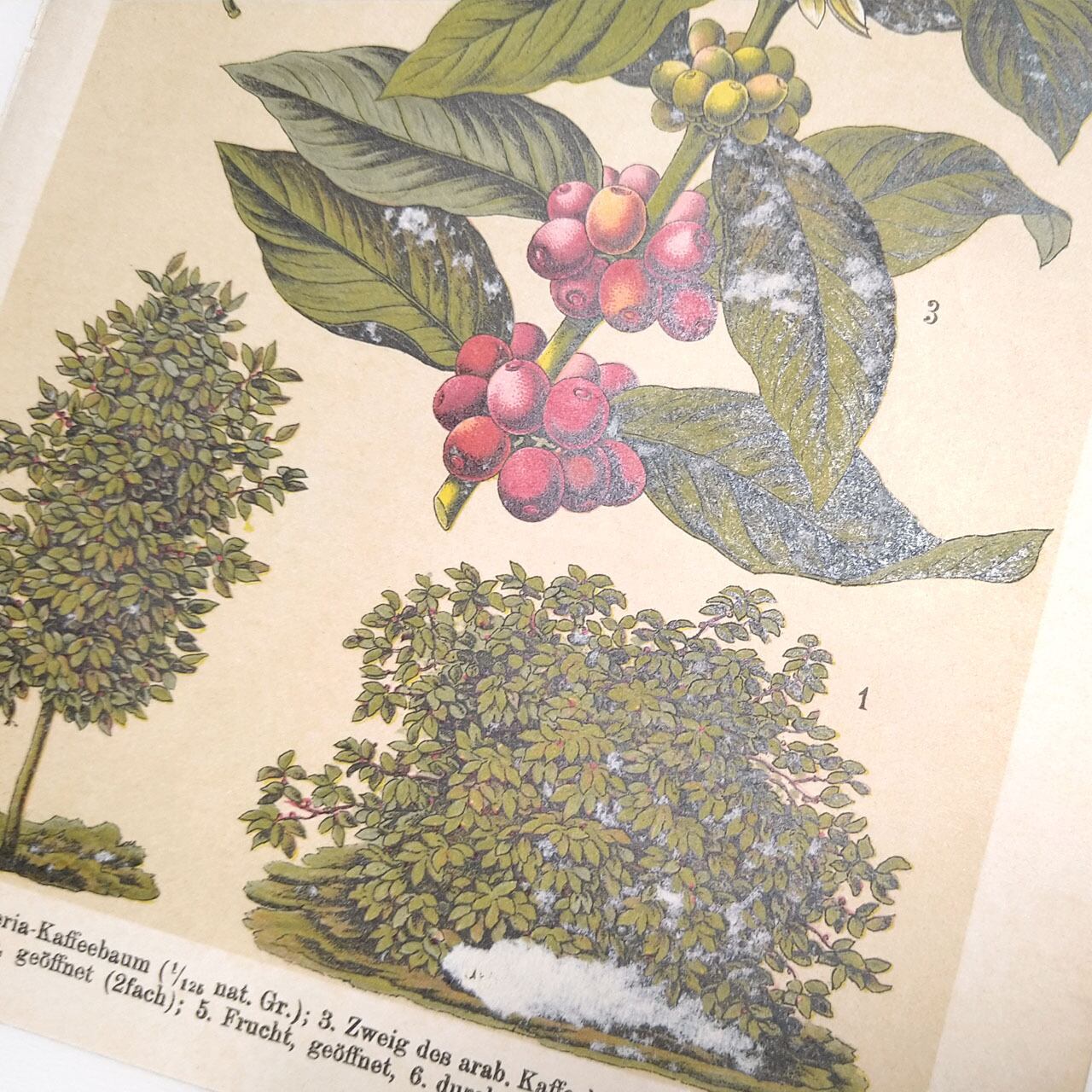 カラーリトグラフのコーヒーの実と木のイラスト面はかなり傷みがあります。