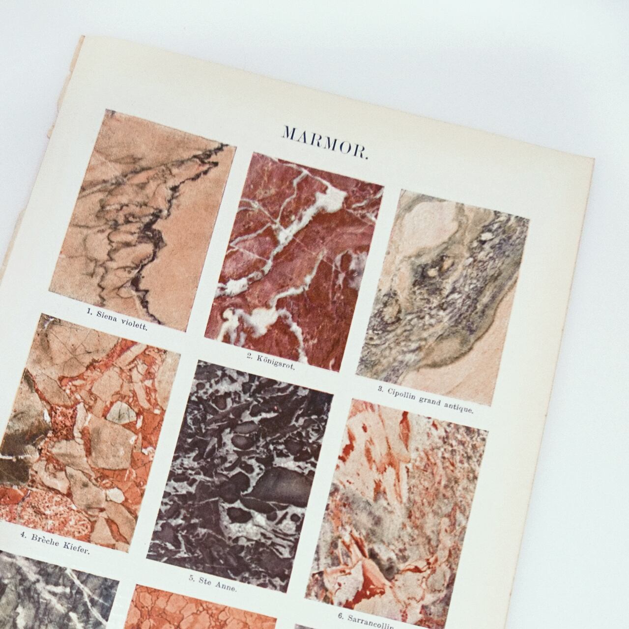 ヘルダー大百科事典からの当時の大理石のマーブル模様の種類を描いたイラスト図版です。