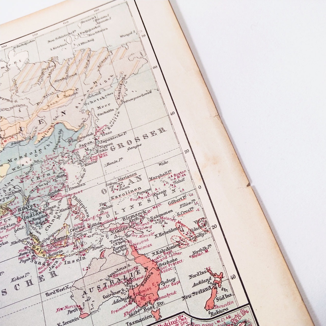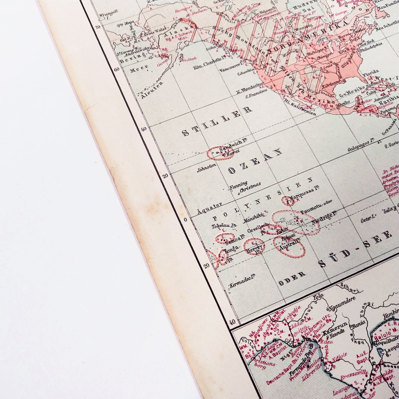 マイヤー百科事典から、20世紀初頭当時の世界の宗教と布教の見開き1ページのカラー地図。