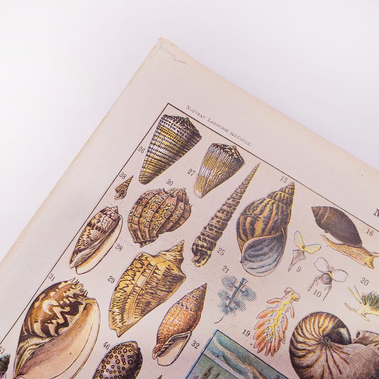 1915年に出版されたオリジナル百科事典からの、貝類やイカなど95種類の海の軟体生物が描かれたオリジナルイラストのアンティーク図版です。