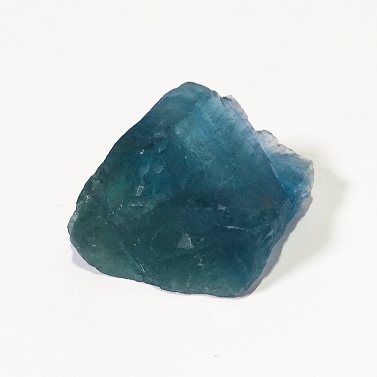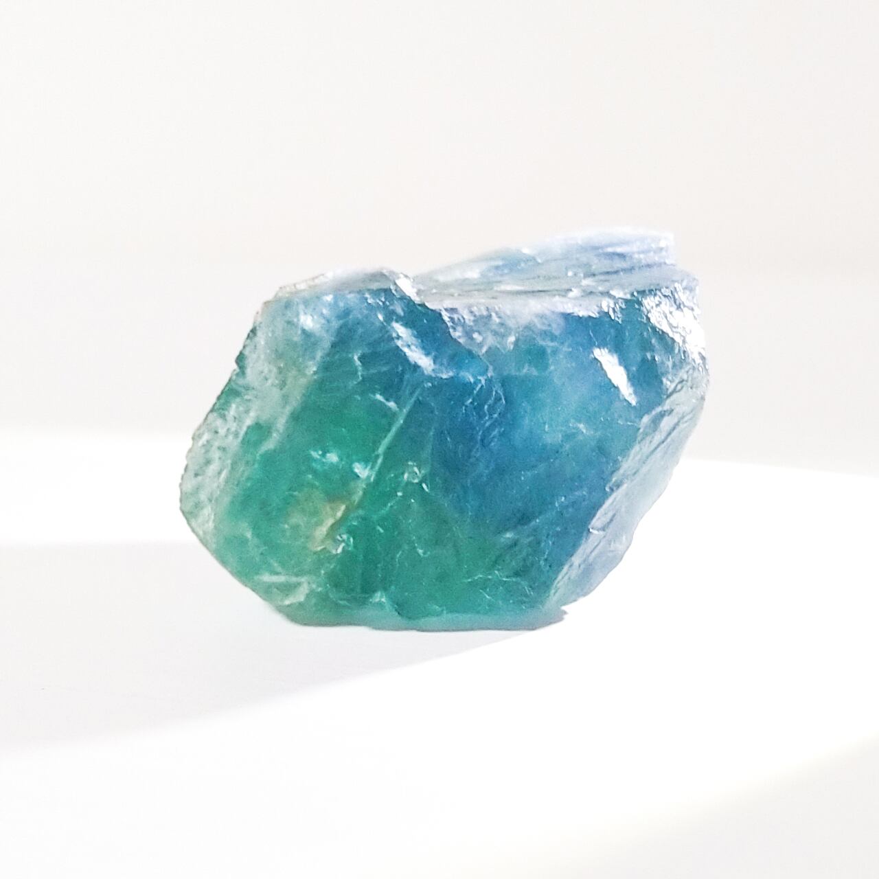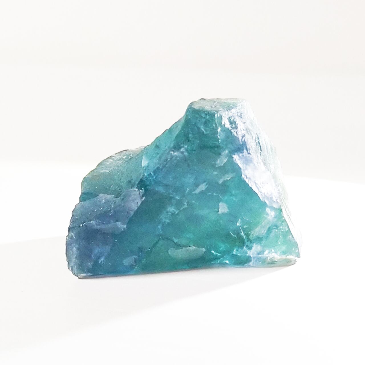 山のような形のフローライト。光にかざすと透き通って見えるブルーからグリーンへのグラデーションになっています。群青のようなブルーが混じりつつ、透き通った綺麗な池のようなターコイズブルーからグリーンへの移り変わりがとても綺麗です。
