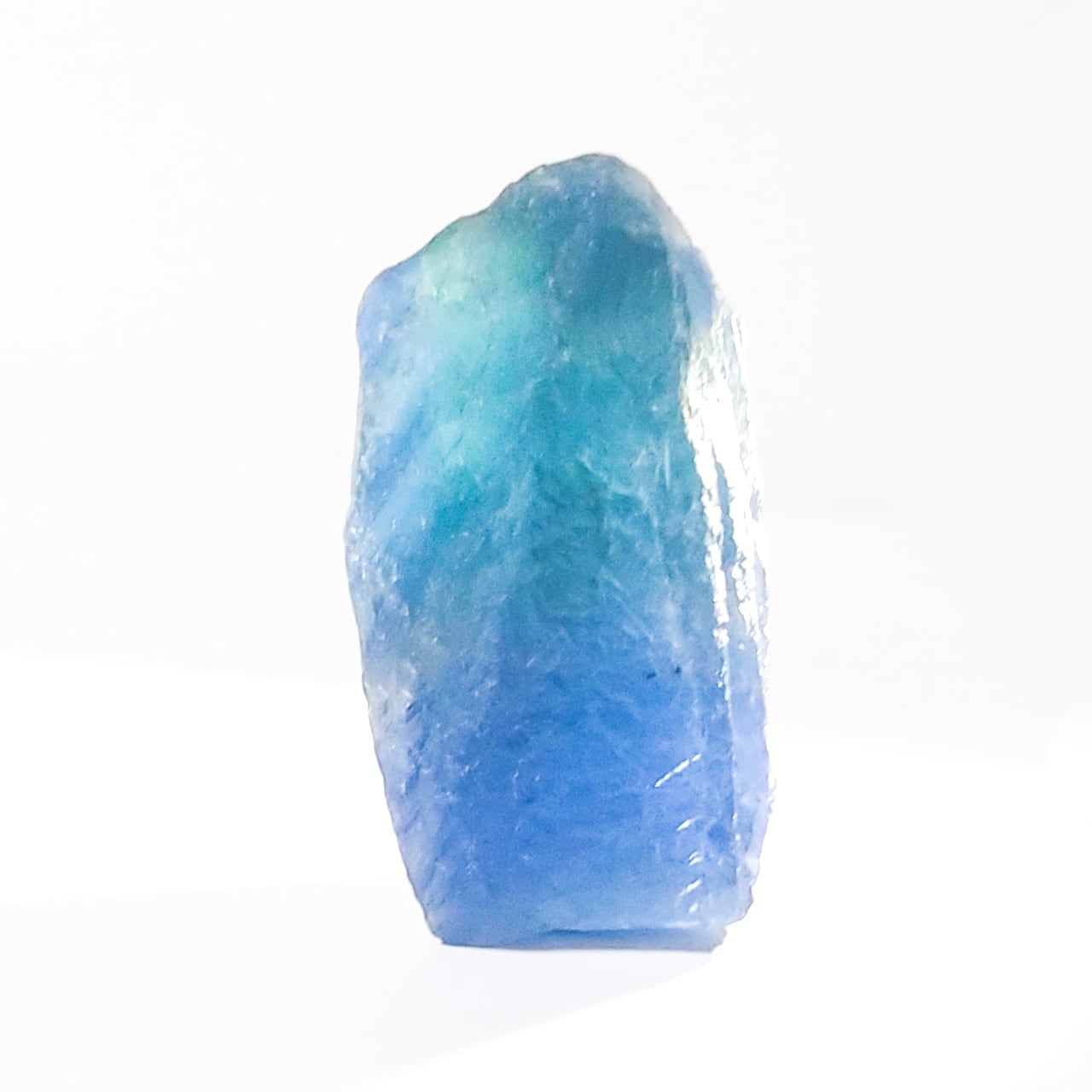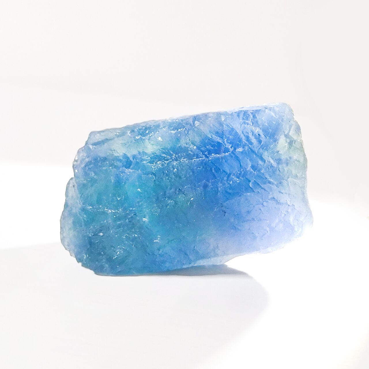 淡いブルーの部分に混じった緑とのグラデーションがとっても印象的なブルーフローライト。光にかざす角度によって色味が変わって見えるのも素敵です。