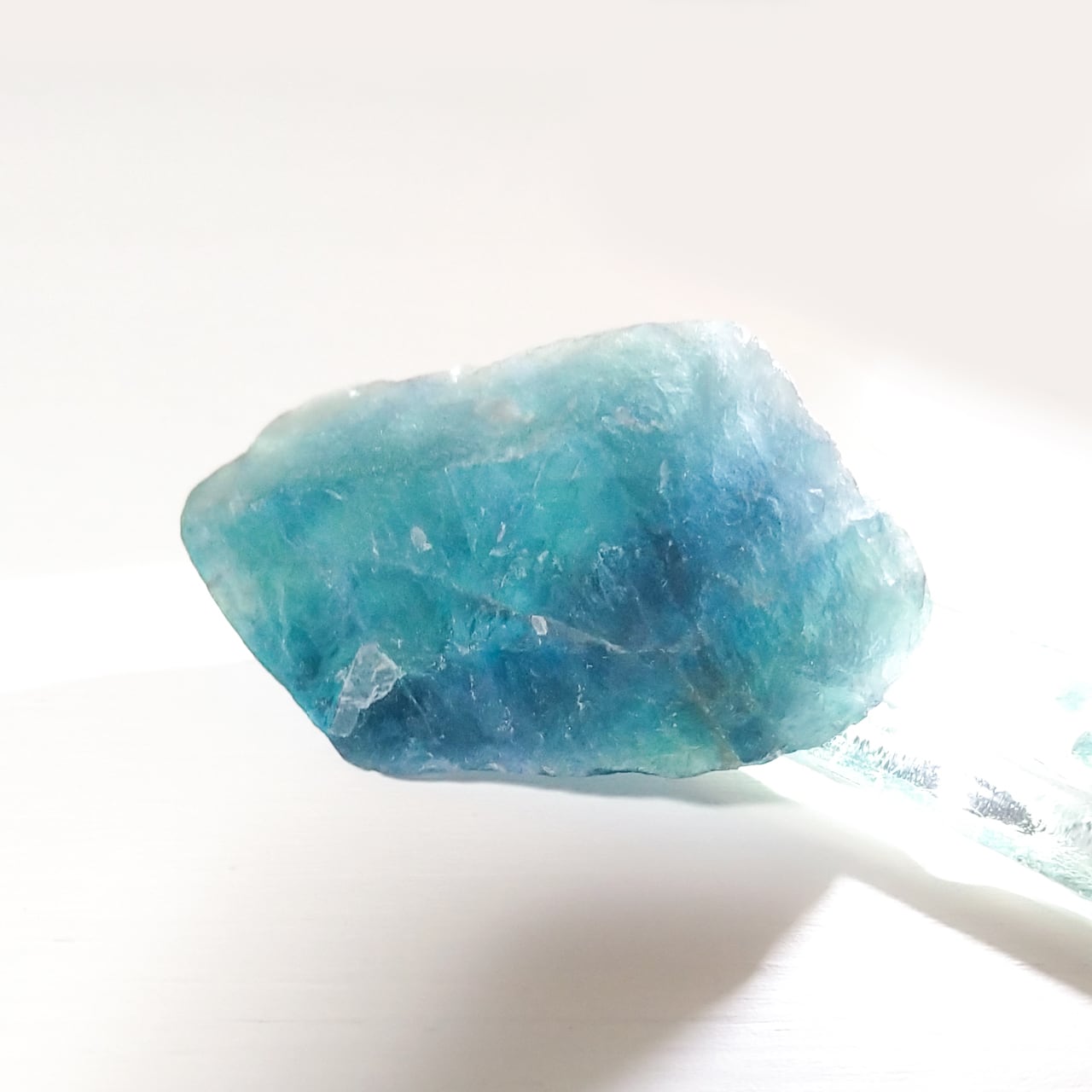 美しいブルーの濃淡の中にグリーンの混じったグラデーションが綺麗な蛍石です。全体的に角ばった四角い形をしています。