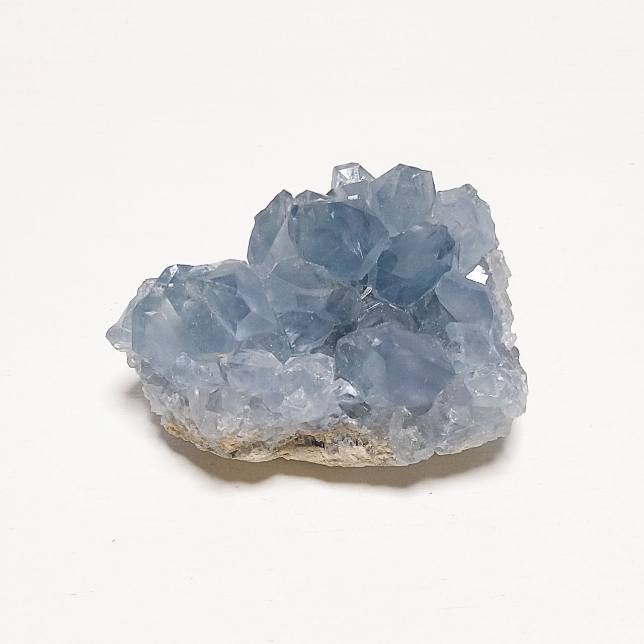 上から見ると三角形のような形のごろっとしっかりした結晶のクラスター。一つ一つの粒が大きめで淡いブルーの濃淡があり、透明度が高いので結晶の中もよく見えキラキラと光を反射してとても綺麗です。