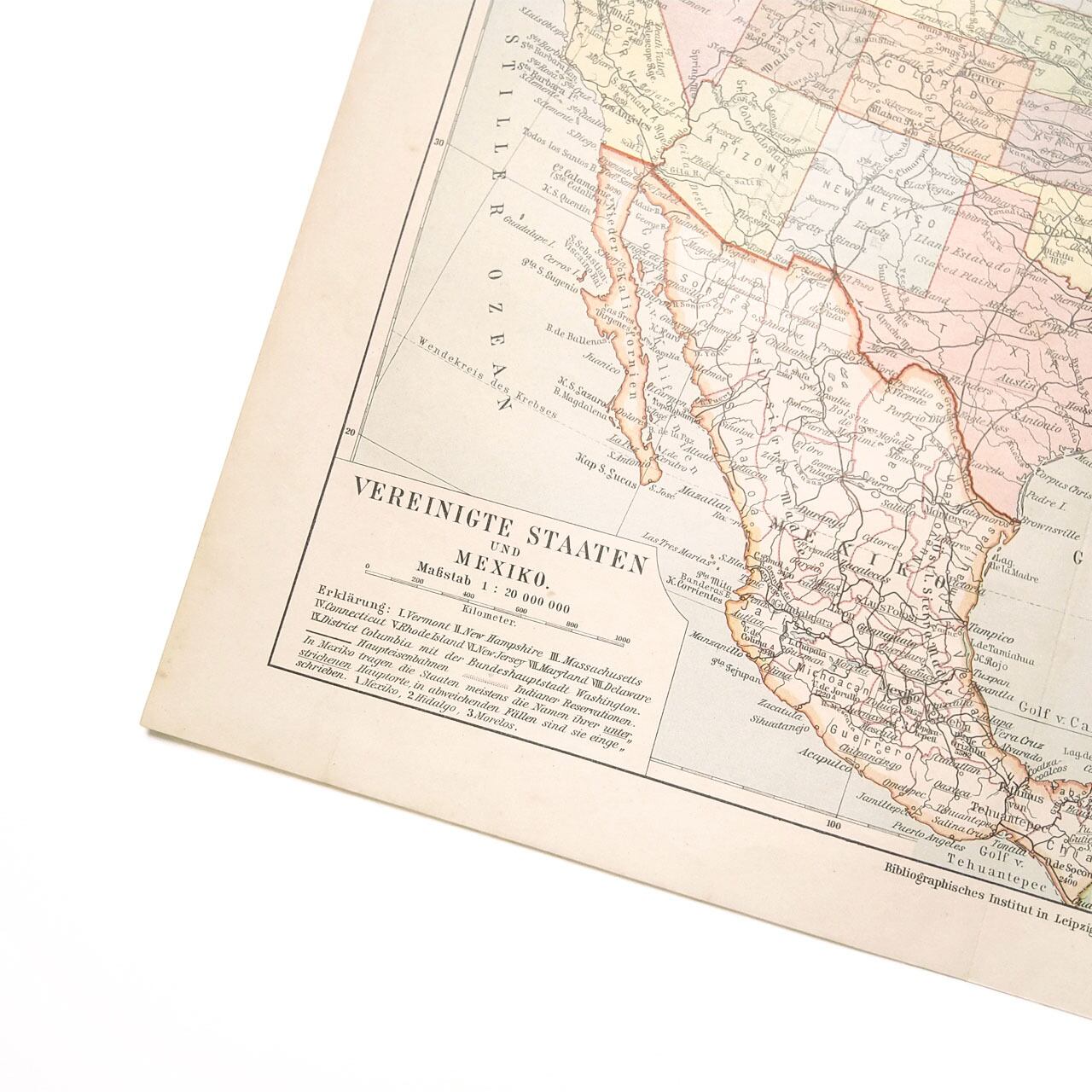 マイヤー百科事典から20世紀初頭当時のアメリカとメキシコの見開き1ページのカラー地図です。